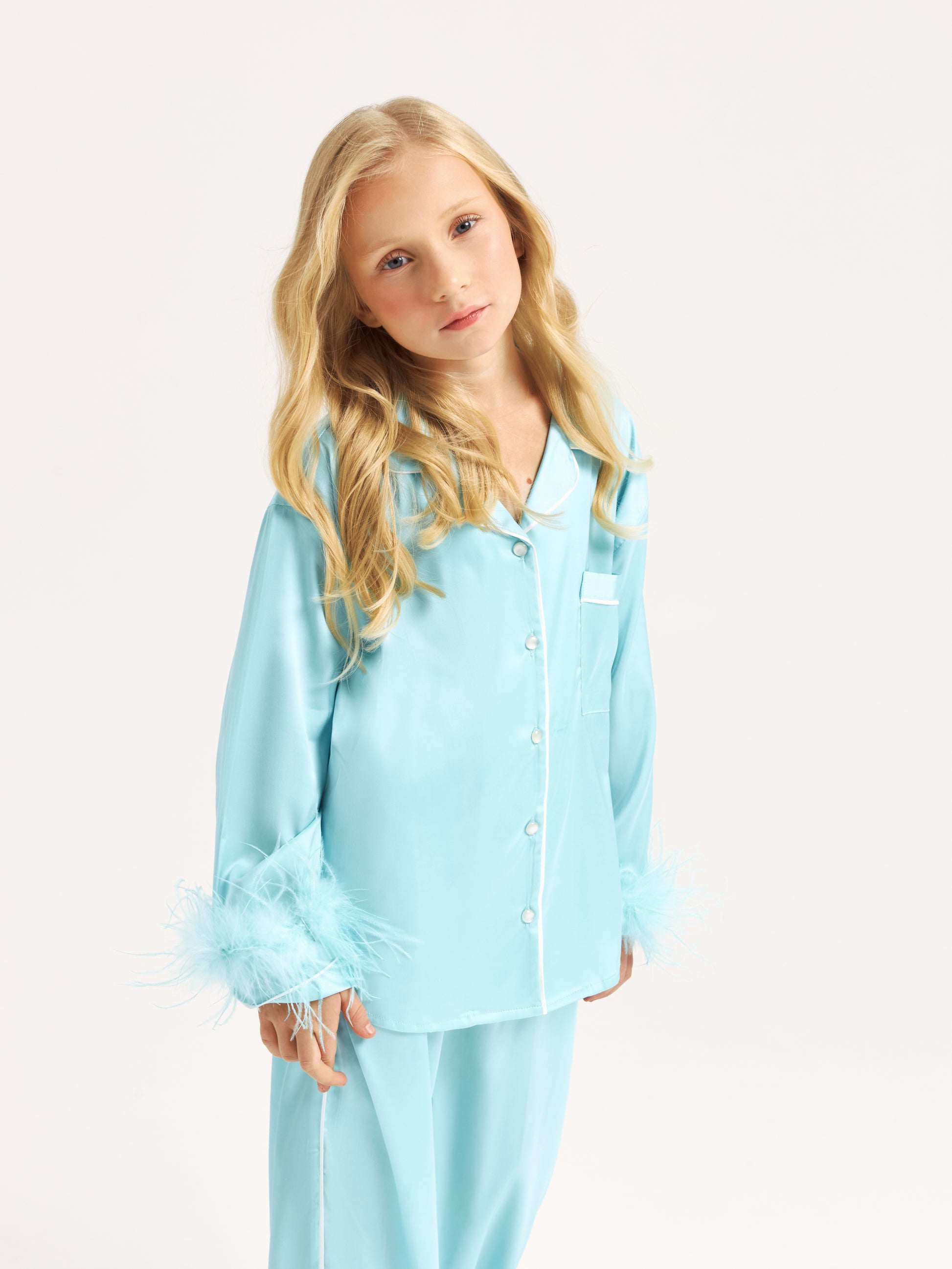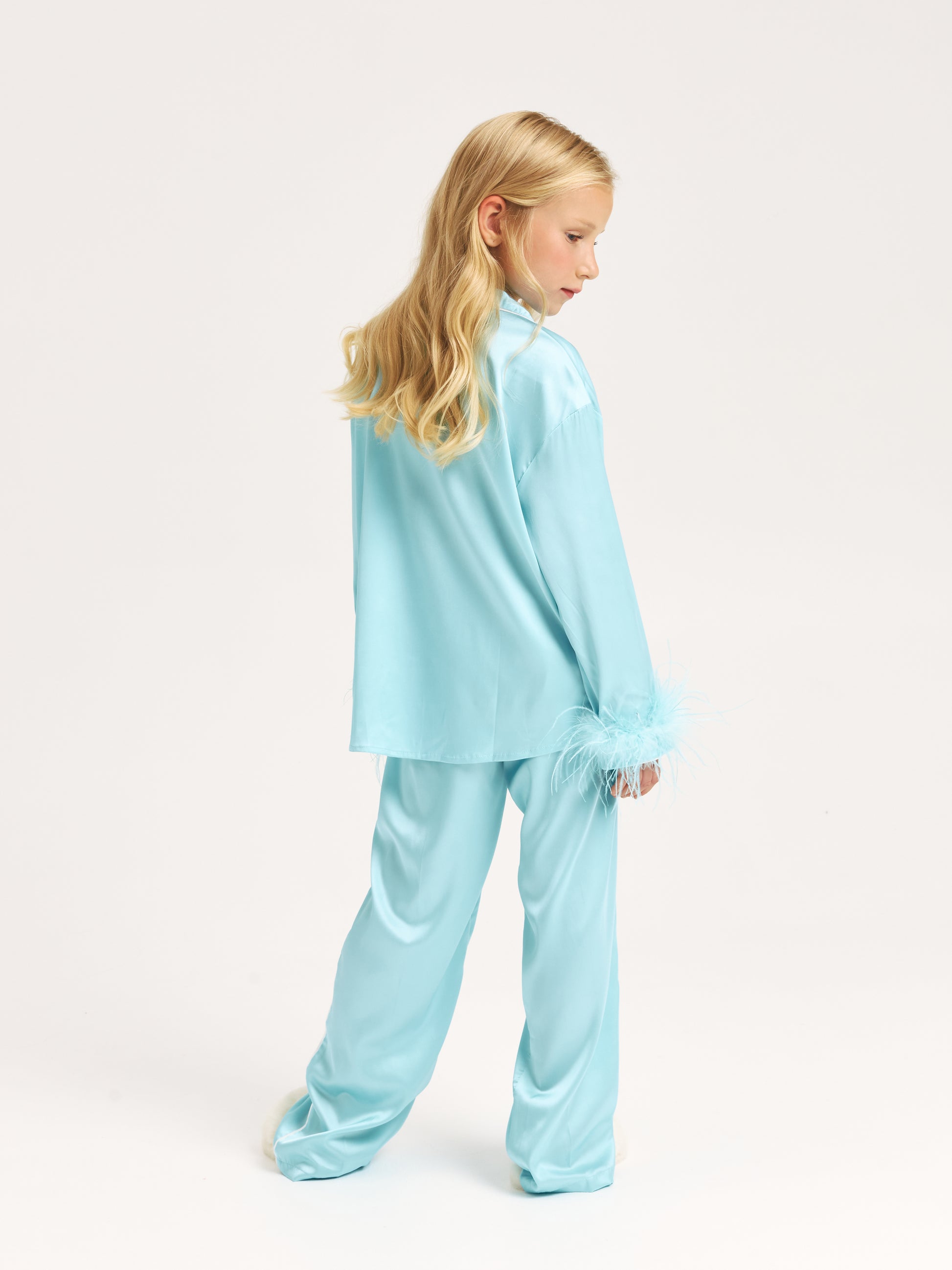Crafted from silky-smooth fabric, this set feels gentle on the skin while offering a polished, elevated look. The fluid silhouette and fresh Tiffany hue add a subtle luxury touch, making it perfect for relaxed moments and special days alike.